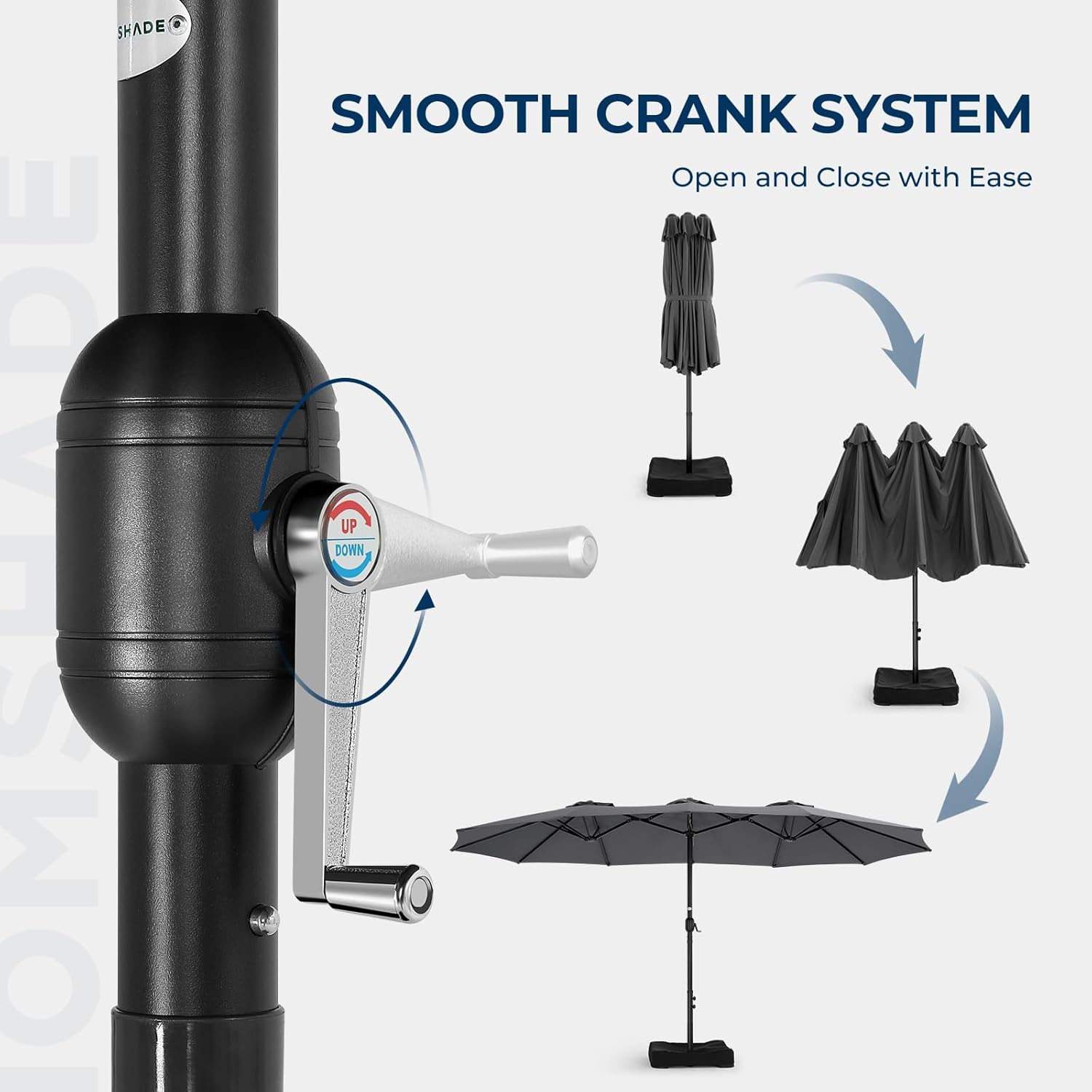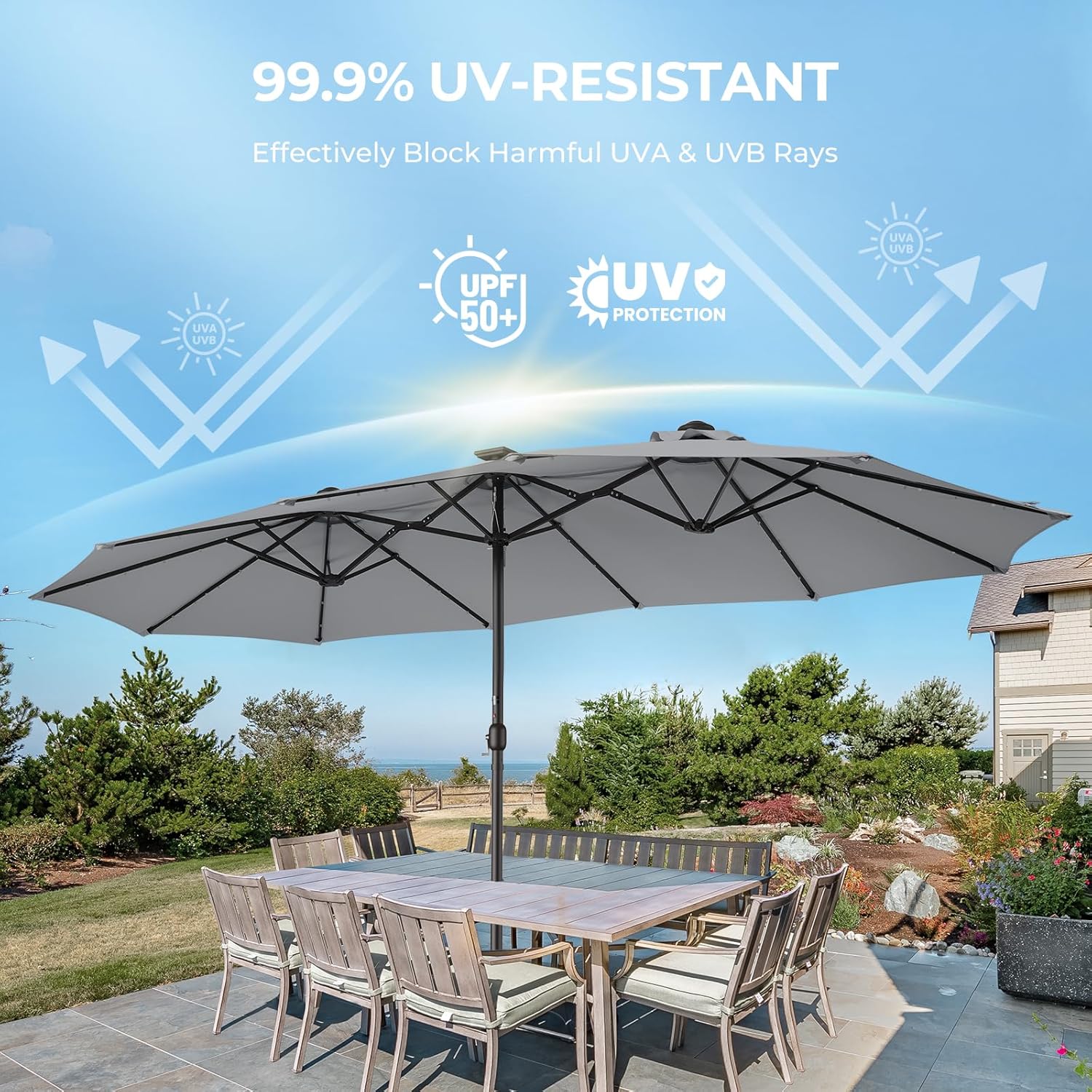 [Double the Shade, Double the Fun]: With 135 sq ft of shade (enough for 8-12 chairs), this 15ft double-sided patio umbrella is perfect for hosting family and friends in comfort.