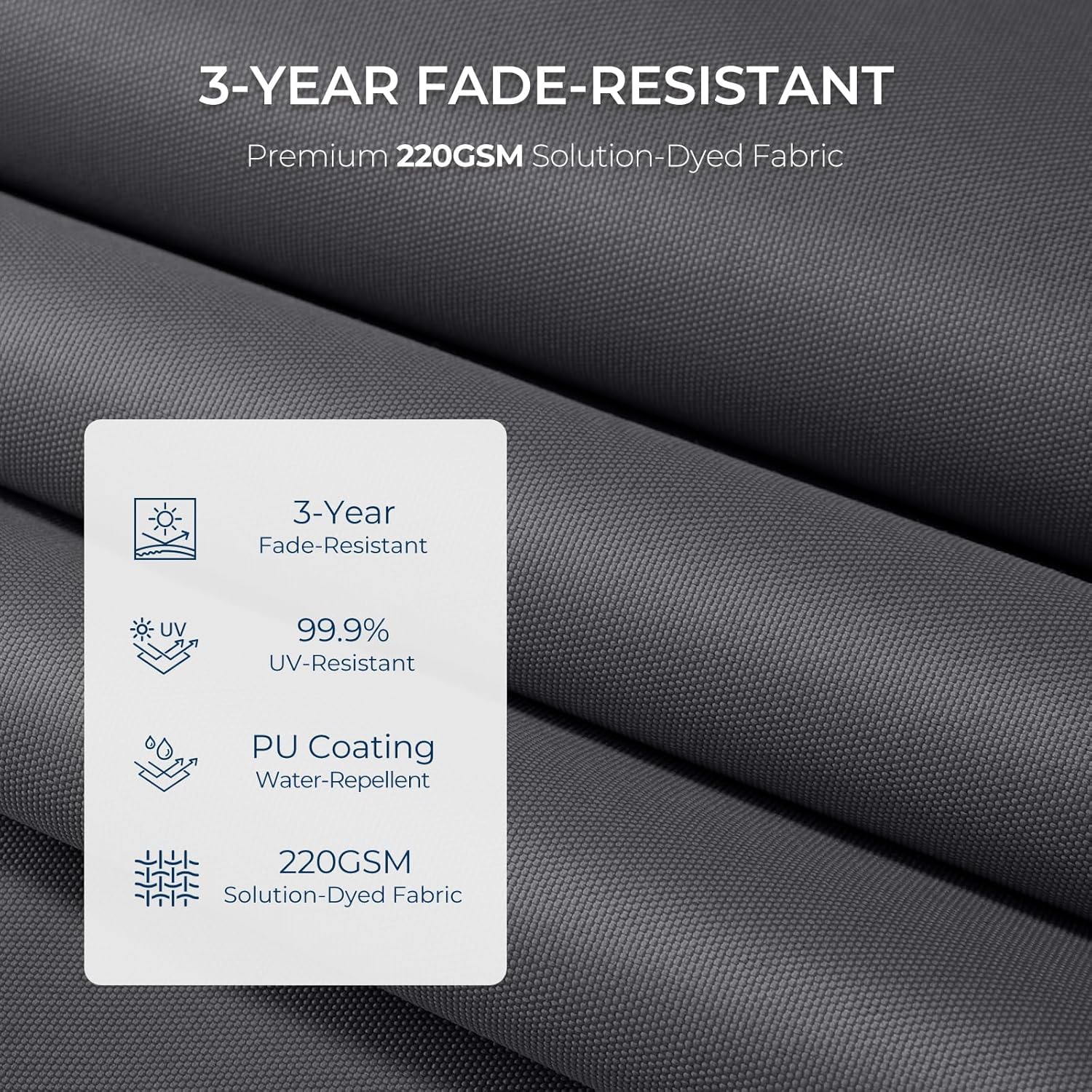 [Engineered for Durability]: Built with 12 heavy-duty steel alloy ribs (20% thicker at 12x18mm) and 3 top vents for better airflow, this outdoor umbrella stays steady even on windy days. The 220gsm solution-dyed fabric resists fading for 3+ years.
