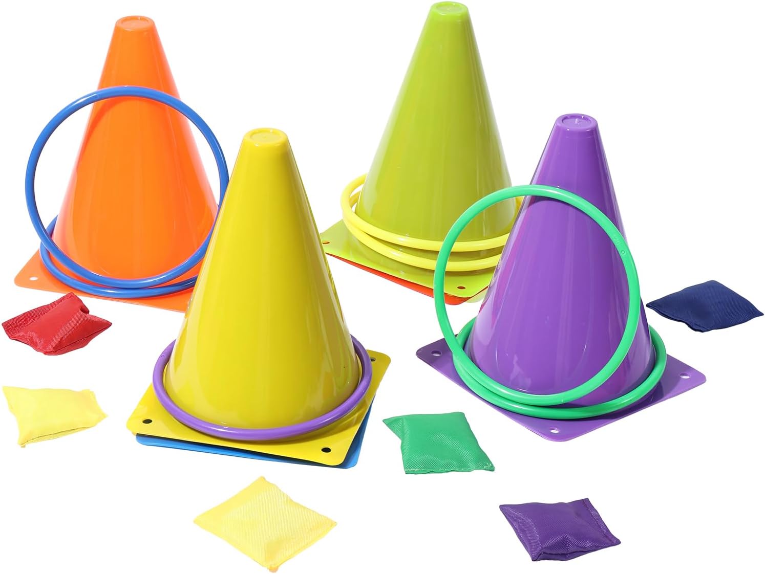 3-in-1 Cones Ring Toss Combo Set :Including 6pcs soft cones (7.2×5.1inch), 24pcs colorful rings (4.72inch),12pcs Bean Bags(1.96inch) 1 mesh carry bag
