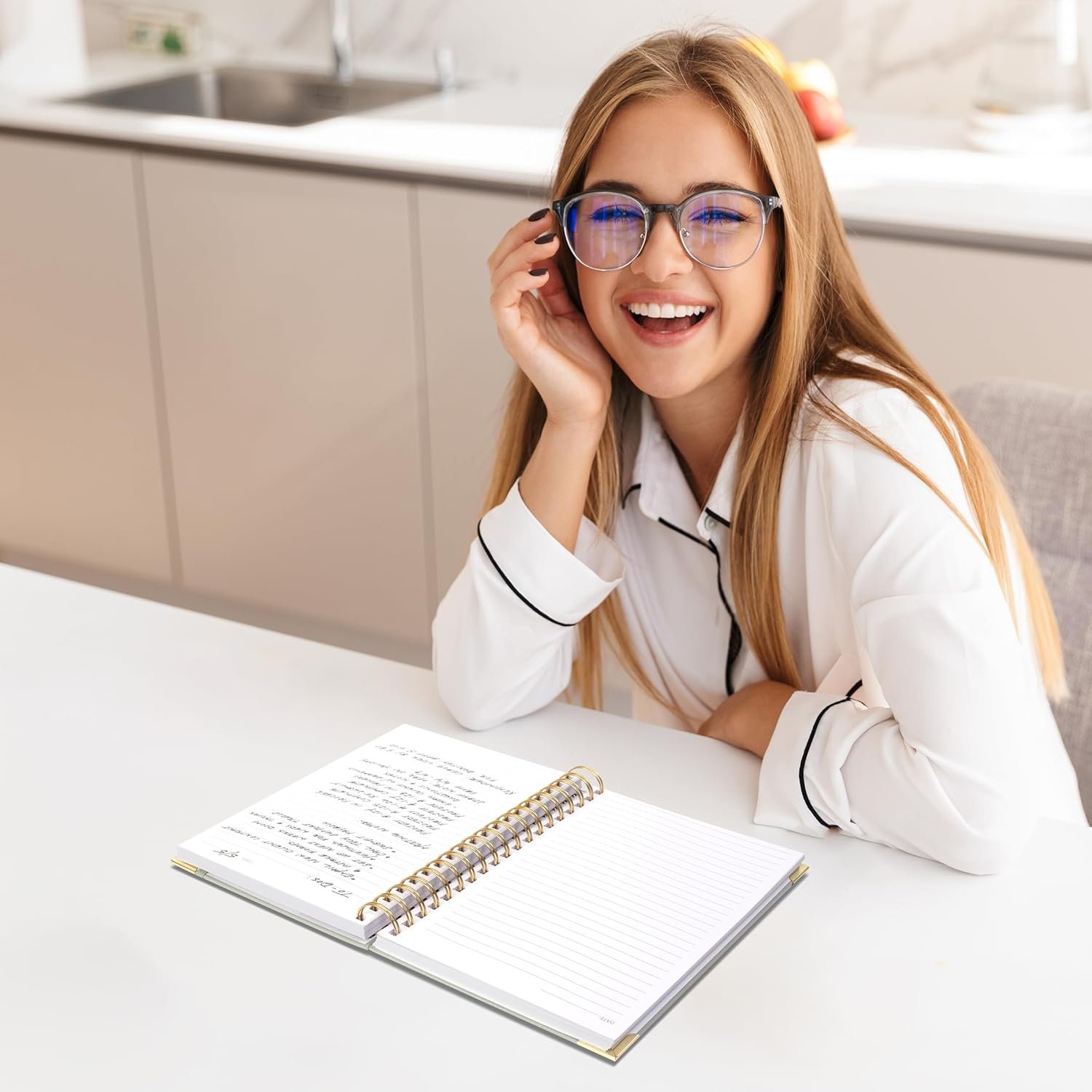 I absolutely love this notebook! The soft blush pink cover with gold accents gives it a classy and elegant look. The sturdy spiral binding makes it easy to flip pages, and the reinforced corners add a nice touch of durability. Inside, the pages are cleanly lined and include a space for the date, which is perfect for staying organized. The paper quality is smooth and great for writing with any pen.What made this purchase even more special was the personal thank you card included by the sellerâit added such a thoughtful and warm touch. Whether youâre journaling, taking notes, or making to-do lists, this notebook is both stylish and practical. Highly recommended!