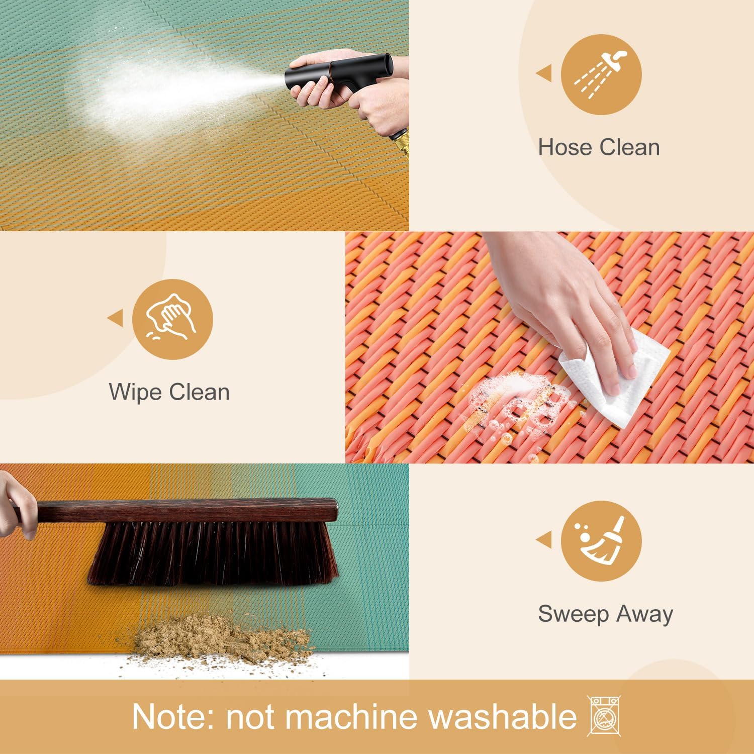 [Easy to Clean & Quick Dry] – Our outdoor rug features a breathable woven structure that allows liquids to easily penetrate and evaporate swiftly in the breeze. Simply hose it down or wipe with a wet cloth, then let it dry in the sun. Perfect for high-traffic areas such as patios, deck gardens, beaches, picnics, and RV camping