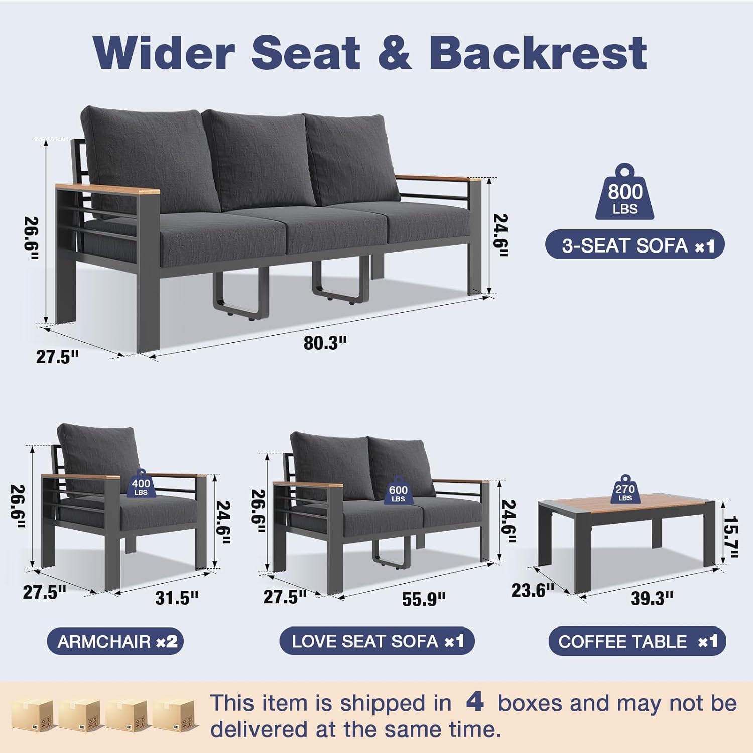 【UPGRADED】① Wider 26 in seat & Thicker 5 in cushion, (industry standard 24 in & 13 in); ② Reinforced Structure, Hurricane-grade steel frame with thickened support beams; ③High-end a luminum with heat treatment wood grain coating, more fashionable and reduce the metal heat in summer, protect the skin; ④Top Olefin fabric, easy to clean, ten years without fading