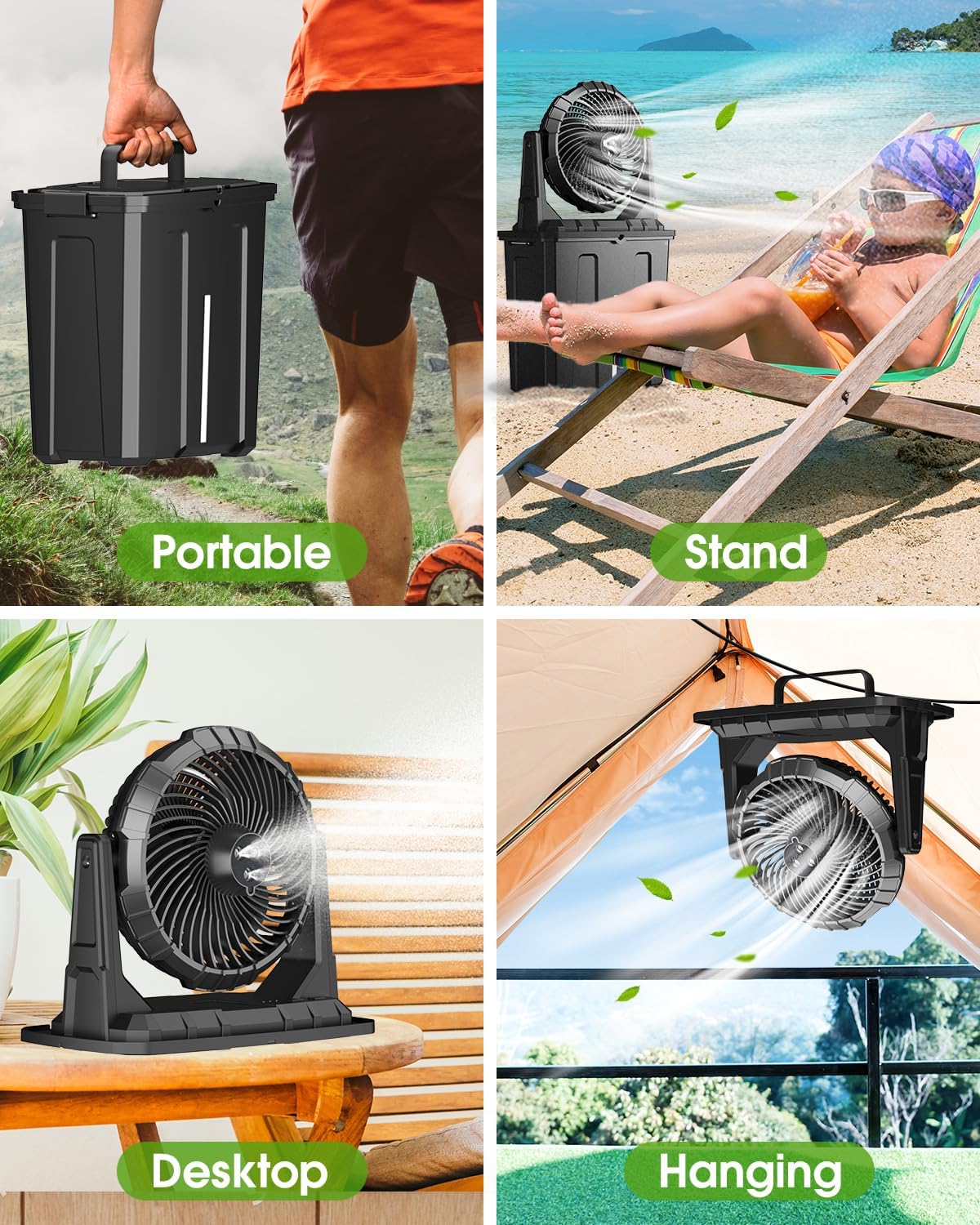 ⭐【Patio & Camping Fan】- The outdoor fan base features a hook design, making it great patio deals for both tabletops and floors. It also doubles as a camping essentials—easily hang it from trees, RV car bars, tents, and more!