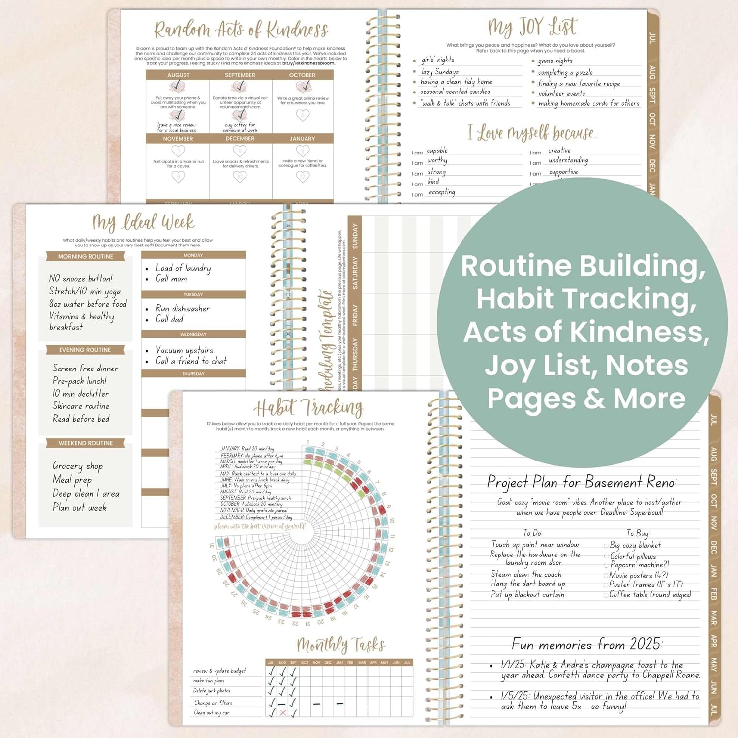 As always, I was delighted with my new Bloom planner. This is the Ocean Oasis, and it’s a spiral, softcover, 5 1/2″ x 8 1/4″ planner. The Ocean Oasis cover looks like a gorgeous seaside beach, viewed from an airplane or drone. The colors are a soft aqua/white/tan. Very restful (especially if you love the ocean!) In gold cursive on the cover are the lower case letters of the year: “twenty five twenty six.” So this planner begins in July of 2025 and carries you to July of 2026.Inside, this planner’s cover has a vertical pocket facing your name and contact info. Below that is the question: “How will you bloom?” That’s followed by lines for you to record your personal mission statement for the year. Next, you’ll find two facing pages with the entire calendar years of 2025-2026, laid out in nicely-sized squares with the daily calendar dates. 7 planning/vision pages are included immediately after those (Values, Where You Are & Where You’re Going, Things NOT to do, The Year of More and Less, Random Acts of Kindness, My Joy List, This Year’s Visions and more).Then, we get to the pages where you’ll begin to build your calendar, with My Ideal Week, Weekly Scheduling Template, and bill tracking and payment pages, with a habit tracking spiral diagram and a monthly tasks list. Several lined pages are included for additional notes. And now, the calendar! The clear weekly lined spaces begin with June 30 (Monday) through Sunday, July 6. When you turn that page, there’s a tab with the abbreviated month (“Jul”), which opens to the clean monthly calendar page. Each of those has large squares for you to note your events and appointments, plus a To-Do column with lines on the side. Each monthly page has a meaningful quote as well.The weekly lined spaces start with Monday and End with Sunday. There’s a section to list your week’s Top Priorities, that month’s calendar in a small square at the top, and plenty of space to write your daily responsibilities and events in each day’s lined space. The planner’s calendar pages end with August 2, followed by a page for you to list your Monthly Highlights plus a page where you’ll be able to jot your Important Dates for Next Year as those appointments are scheduled. The last page, A Year of Growth, enables you to jot down how you’ve grown in the life areas you considered at the beginning of the year. The planner closes with another vertical pocket on the back cover, plus a page of fun stickers and a magnetic bookmark with a fun saying on it.Bloom planners continually provide everything I’d love to have in the ideal planner. This Ocean Oasis planner is lovely and contains all I need in an easy-to-carry, sturdy spiral notebook.