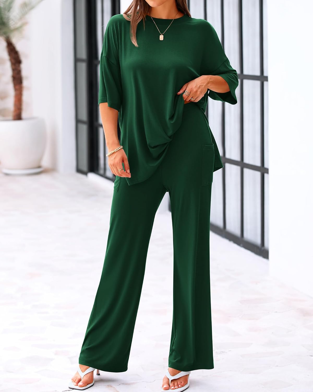 8 reviews for BTFBM Women 2 Piece Outfits Casual Loose Slit Short Sleeve Top Wide Leg Pants Matching Lounge Sets Tracksuit With Pocket
