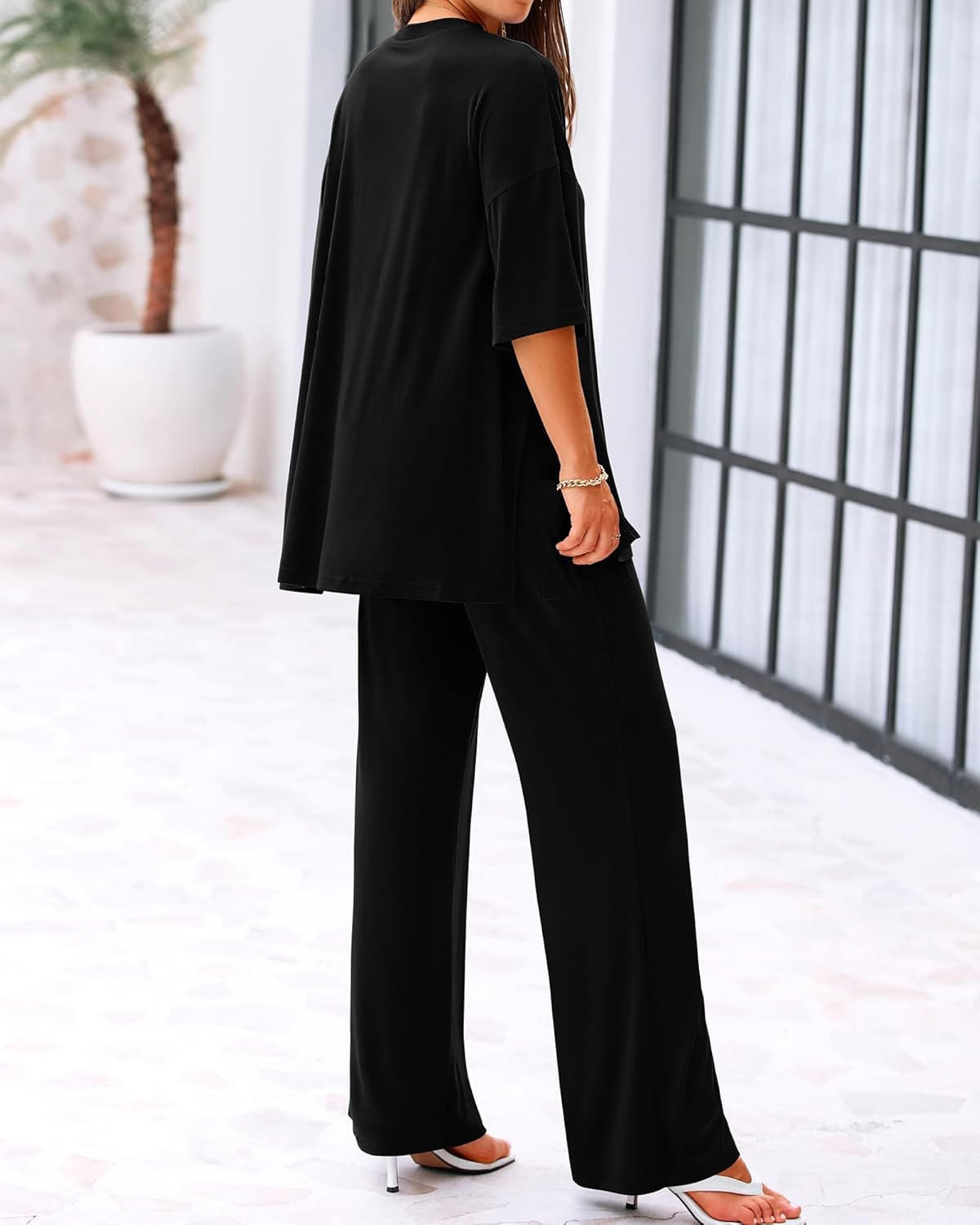 8 reviews for BTFBM Women 2 Piece Outfits Casual Loose Slit Short Sleeve Top Wide Leg Pants Matching Lounge Sets Tracksuit With Pocket