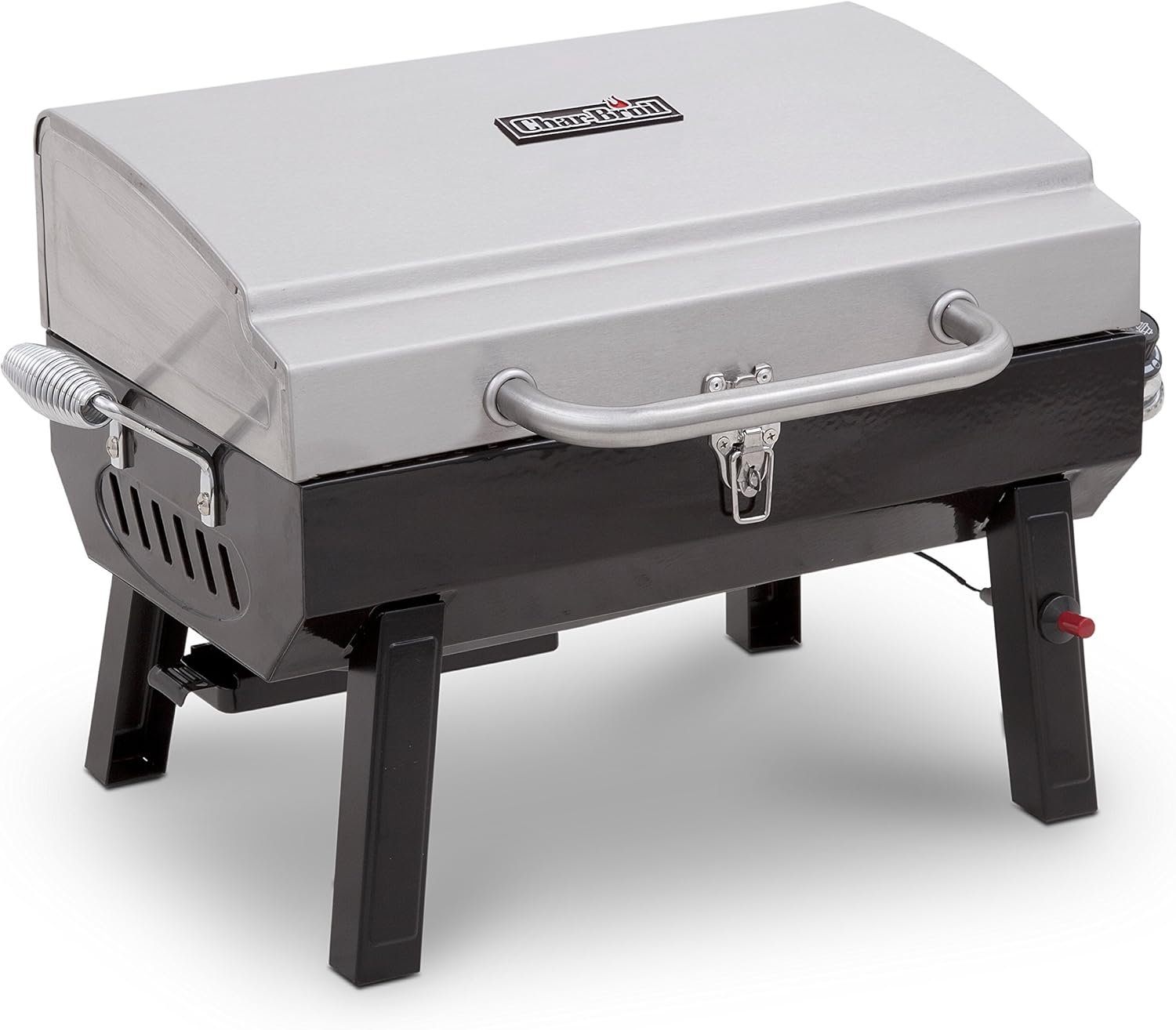 The Char-Broil® 1-Burner portable gas grill features a sleek stainless steel design for your on-the-go grilling. It uses propane canisters and lights up with the push of a button. It’s designed to be sturdy and convenient, so you can set up your grill with you when you’re tailgating, camping or on the beach.