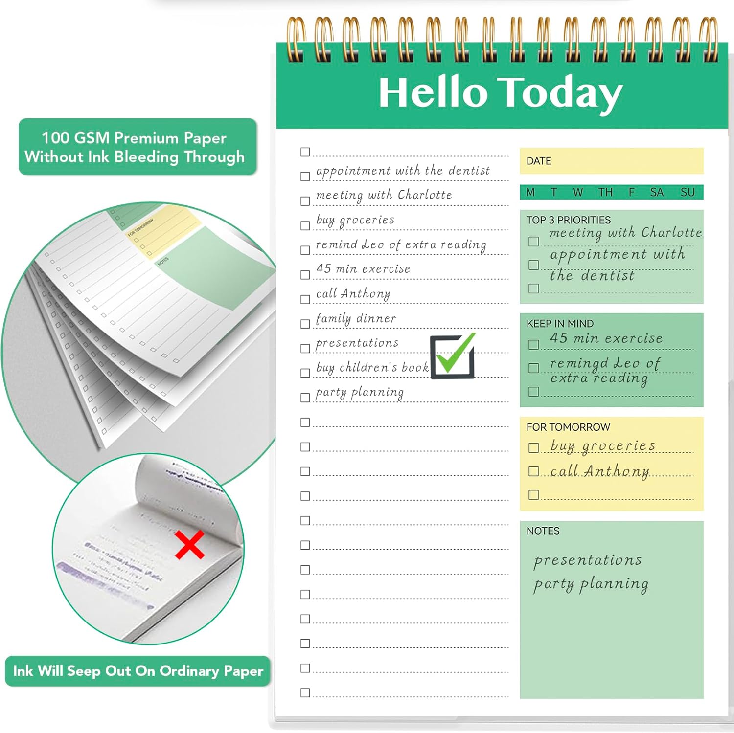 Multiple Sections Design for Better Tasks Management: Our design features with different functional sections and offers ample space for you to write down all your thoughts. The sections of CHECKLIST, TOP PRIORITIES, KEEP IN MIND, FOR TOMORROW, and NOTES offer you a clear overview of the urgency levels of tasks, and you can easily conquer your tasks in order.