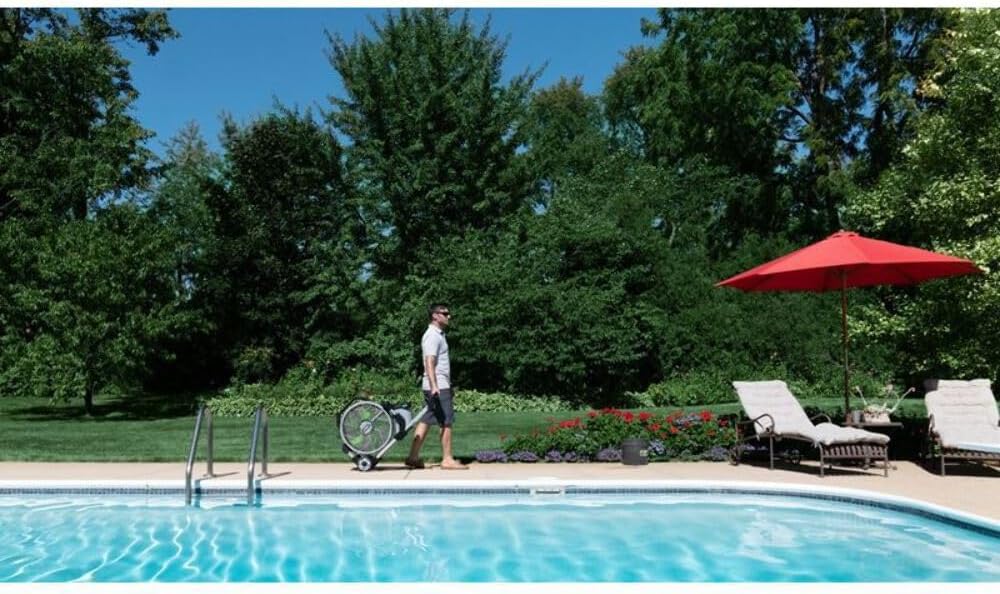 This thing is amazing and is a great addition to the other ego products I have. I already have batteries and a charger so that factored into my purchase decision. Out of the box, you’ll need to attach the handle and the 2 wheels – very easy. You’ll need a clean 5 gallon bucket (does not come with a bucket, so if you don’t have a bucket you’ll need to buy one), filled with cool clean water so you can drop the built in line with filter into the bucket. I got a food grade bucket with a lid and drilled a hole through the lid to drop the line in – this helps keep the water clean from debris. Add your fully charged battery, position your fan and bucket of water (this took a few tries to get the distance just right) and turn it on. Yes, this fan makes noise and the noise increases with higher speed settings… I’ve never come across a utility fan that doesn’t make noise. Some reviews mention that the nozzles leak and while mine do too, it is not a deal breaker as the “leak” depends on the angle of the fan and the puddle is minimal at worst. I suppose I could tighten the nozzles like another reviewer did but it’s just not a problem or enough of an inconvenience for me to do that. Battery life: I have been using the large ego battery and so far I’ve clocked 10.5 hours and still have more than half of a charge available. As for water consumption, the full 5 gallon bucket of water will last 1.5 hours on the high setting. This fan is perfect for me and has made it comfortable for me to sit on my porch again in this ridiculous heat we’ve been having in the south. Also, with the wheels and extendable handle, it is easy for me to move the fan around as needed.