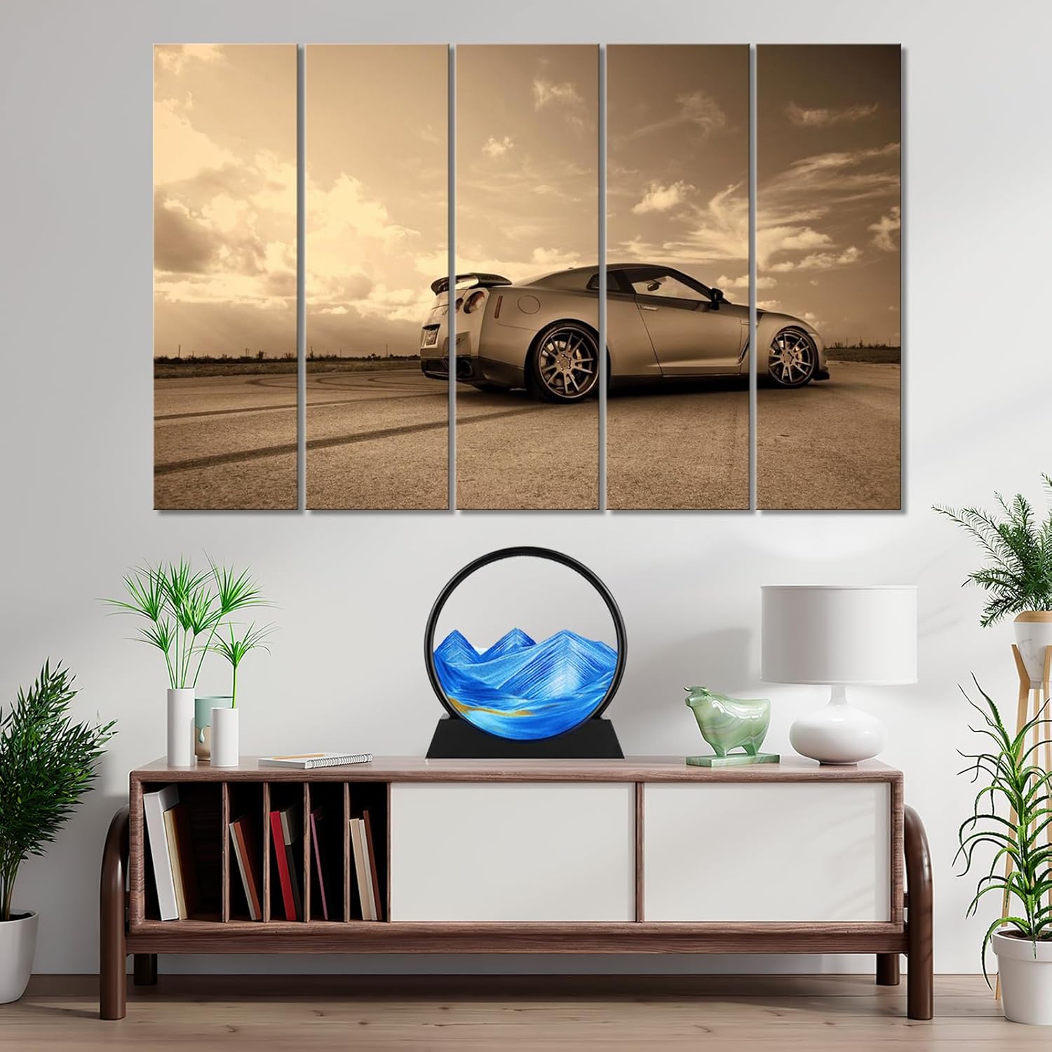 Fun sand art and looks nice as decor. Moving it at different slopes and speeds changes if youâll get mountains or more flat. Either way, it looks nice and the gold glitter makes it stand out without being too much. Itâs fun to change up and watch the sand flow. Good size too!