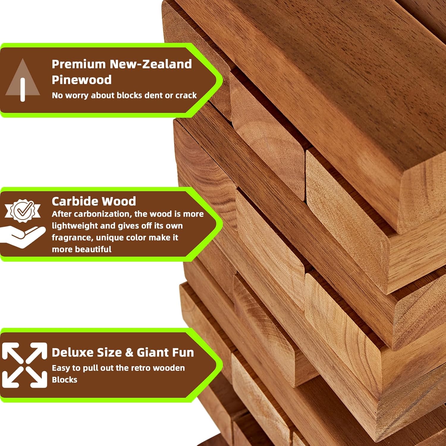 54+2 Extra Pcs Giant Overal Size: This Giant Tumble Tower Set includes 56 pieces Tumble Timbers, 1 pcs Dice, 1 pcs White Scoreboard, a Zipper bag. Touch each of retro wood stacking Blocks measures 7.7×2.6×1.5 in, which is suitable for your hand size. With your strategy, the stacking game can be stacked up to 5FT tall when playing. The higher the block tower grows, the huge excitement and fun you feel