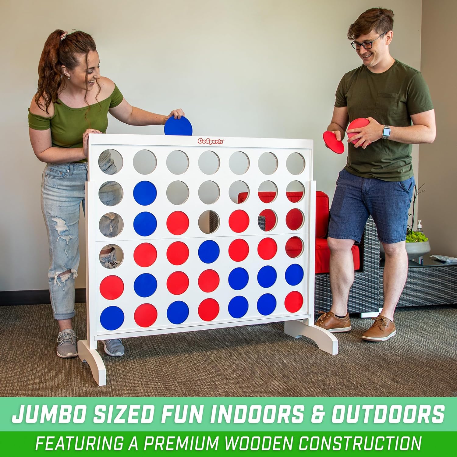 This version is absolutely huge, measuring 4 ft wide and 3. 5 ft tall and is completely portable! The GoSports Giant 4 in a Row Game is a vintage-inspired callback to one of America’s favorite traditional strategy games and plays just the same. The premium solid wood material features a classic white finish for a signature look that sets it apart from shoddy plastic sets. We spared no expense, even the traditional coin game pieces are made from a special durable plastic that will never break. This set also comes with a premium carrying case for neat and safe storage and easy travel to your next party, cookout, camping trip, beach day and more! Thanks to the detailed level of craftsmanship the game is quickly assembled in seconds and ready for hours of fun. With its unique vintage design, sturdy wood build, competitive gameplay, and giant size, the GoSports Giant 4 in a Row Game is a hit for players of all ages.
