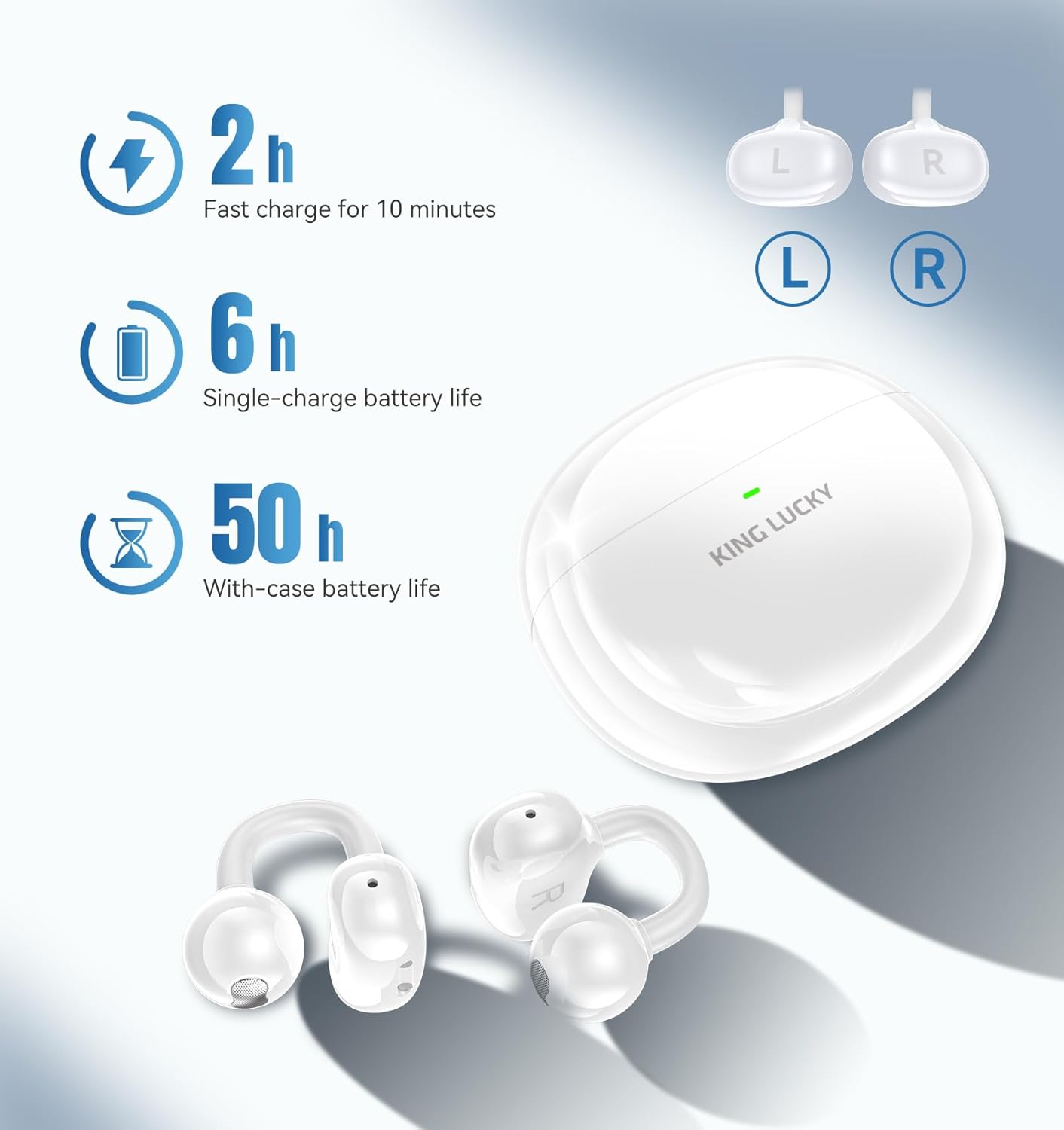 Enjoy Long-lasting Playtime and Superior Connectivity: With up to 50 hours of playtime using the charging case and 6 hours on a single charge, King Lucky ear clip earbuds are built for endurance. Featuring Bluetooth 5.4 technology, these wireless Bluetooth earbuds offer zero-latency, enhanced processing power, and efficient energy consumption, ensuring you stay connected longer.