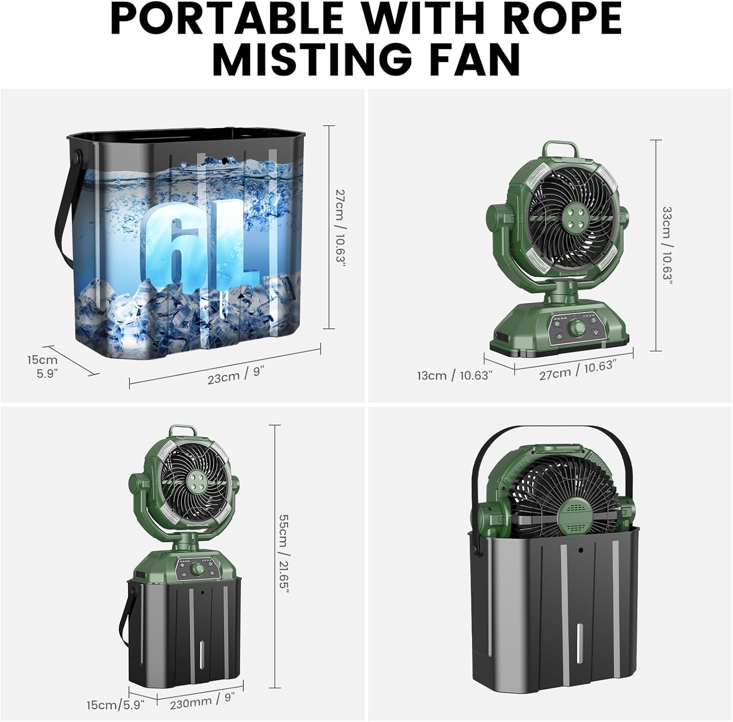 This portable misting fan is a game-changer for outdoor activities! The 6L water tank provides a steady stream of cooling mist that keeps me refreshed on scorching days. The 20,000mAh rechargeable battery is incredibly long-lasting, ensuring you stay powered up through extended camping trips. The built-in LED lantern offers just the right amount of light for nighttime use, brightening up your tent without being too harsh. Plus, the remote control lets you adjust the fan speed and mist settings effortlessly, and the fan oscillates automatically for even coverage. Perfect for any outdoor adventure!