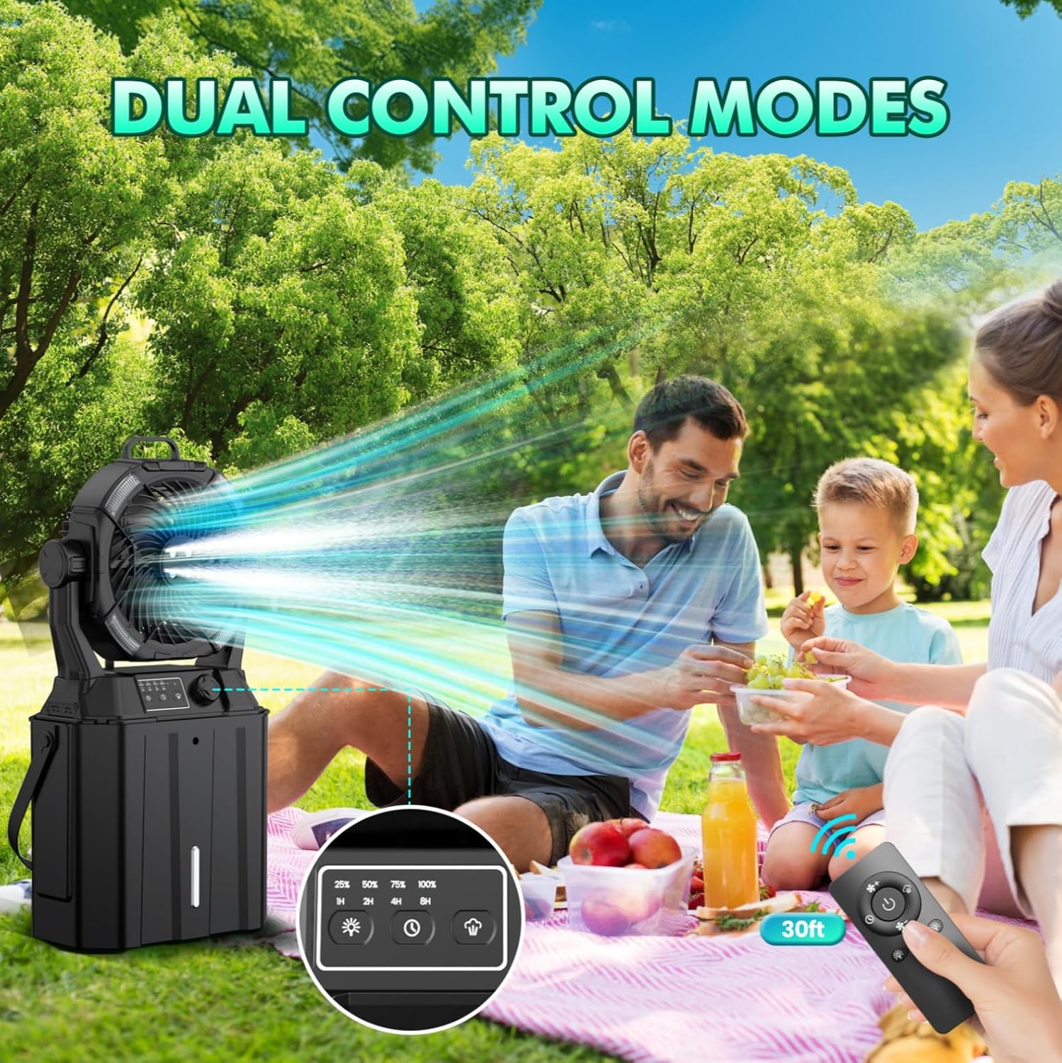 【DUAL CONTROL MODES】 The portable misting fan features dual control modes of panel button control and remote control to help you customize your summer as you wish! The 4-level power display on the control panel helps to clearly check the battery level.22ft remote control distance allows you to adjust the fan speed, light, timer and misting mode in all directions without getting up