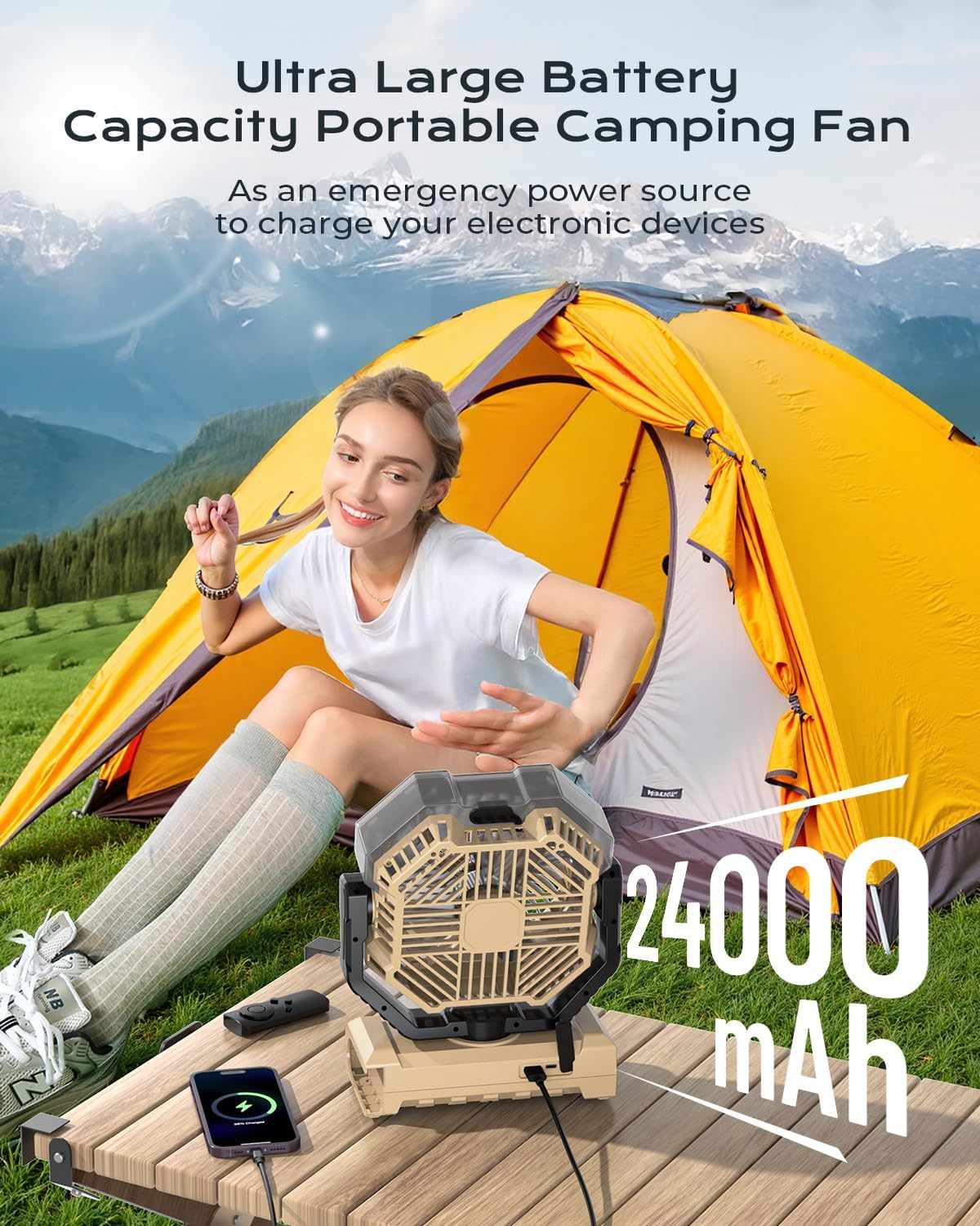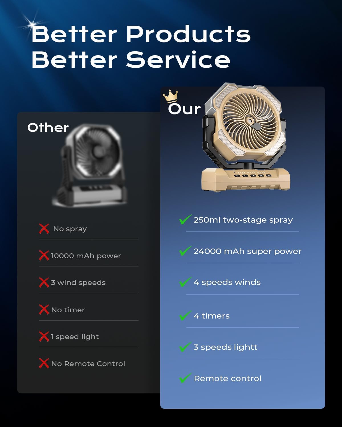 Superior Battery Life & Custom Speeds – Powered by a 24000mAh industrial-grade battery, this mist fan portable delivers unmatched endurance: Turbo (17h), High (30h), Medium (55h), Eco (91h). Its smart energy management system automatically adjusts power consumption across four speeds – blast maximum airflow during midday heat or conserve energy for overnight tent ventilation. Compared to regular misting fans, our model provides 3X longer operation, supported by USB-C fast charging (0-100% in 14hrs).