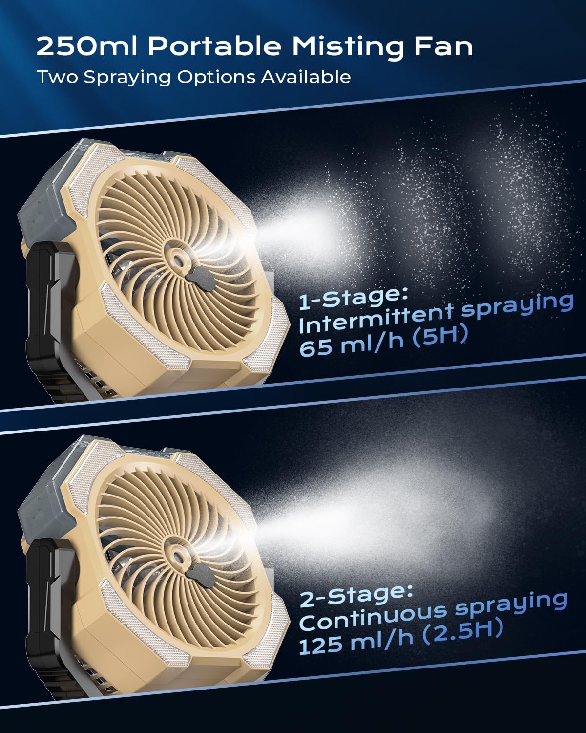 Misting Fan Portable with 250ml Water Tank, 24000mAh Rechargeable Cooling Fans for Outside, Outdoor Water Misters with 2 Mist Modes, Remote Control Camping Fan with Timer for Patios, Beach, Tents