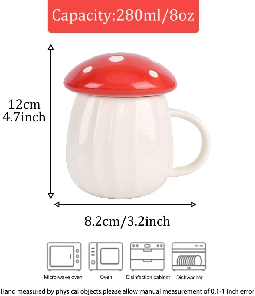 🍄High Quality Kawaii Cup:Mushroom Cup is made of high-quality ceramic which make this coffee mug durable and long lasting. 280ML/8oz Capacity,for Coffee, tea, hot chocolate, lattes, or cappuccinos.