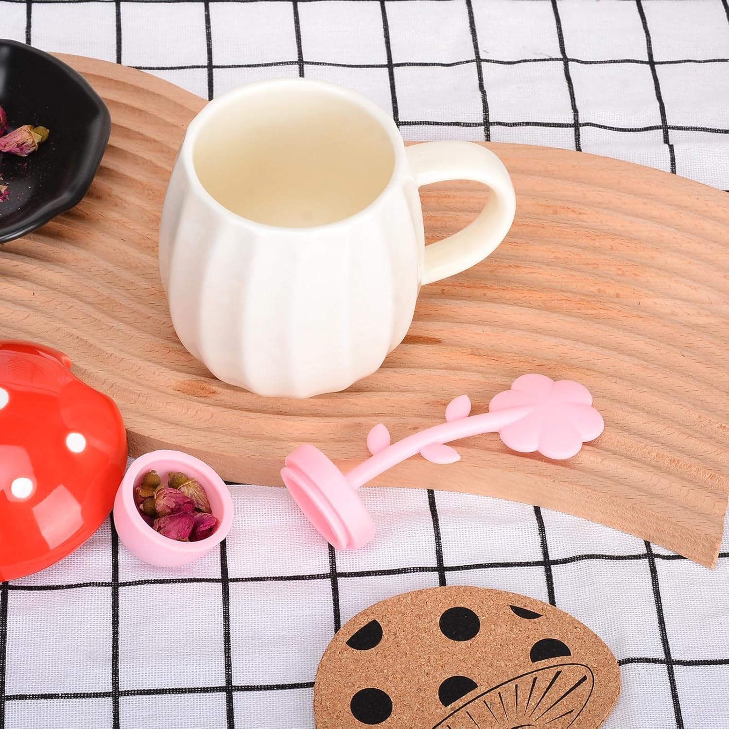 🍄Cute Mushroom Mug: This artsy, decorative cup will bring peace and fun to your hectic mornings. The mushroom cup comes with cute things.Hand-glazed red mushroom cover, Flower Spoon, mushroom coaster, flower tea infuser for loosen tea.