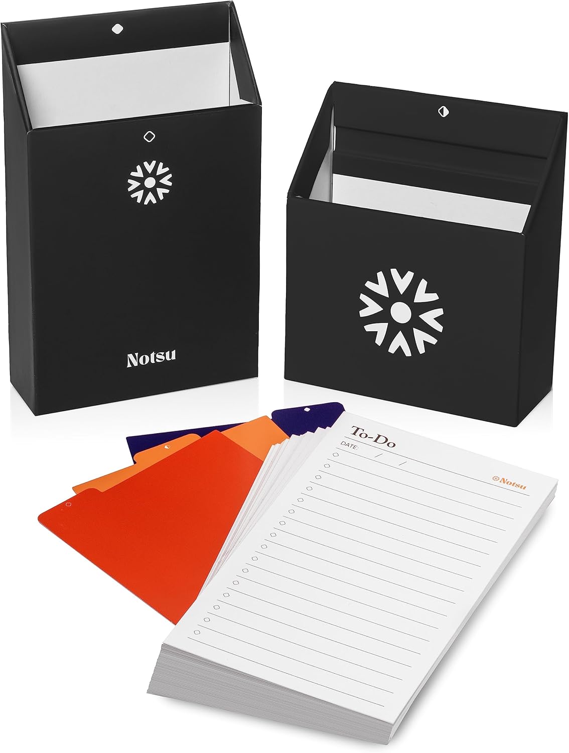 Notsu Centre Rise To Do List Card Box Set | 50 Foldable To-Do Vertical Notecards 3×5, Productivity Index Card Organizer Tab Dividers, Desk Card Holder Stand (Black)
