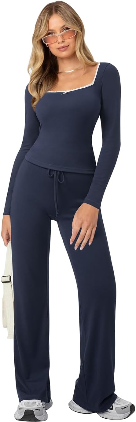 8 reviews for OMKAGI Womens Lounge Set Lace Square Neck Long Sleeve Tops Wide Leg Pants 2 Piece Outfits
