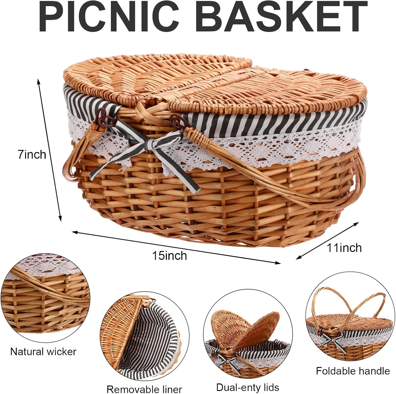 Substantial Meal: the woven basket, crafted from sturdy wicker, is sturdy enough to carry your food and utensils, and the plate, made from bamboo, assures longevity and resistance; The cotton liner is washable, soft and easy to clean, adding to the convenience of use