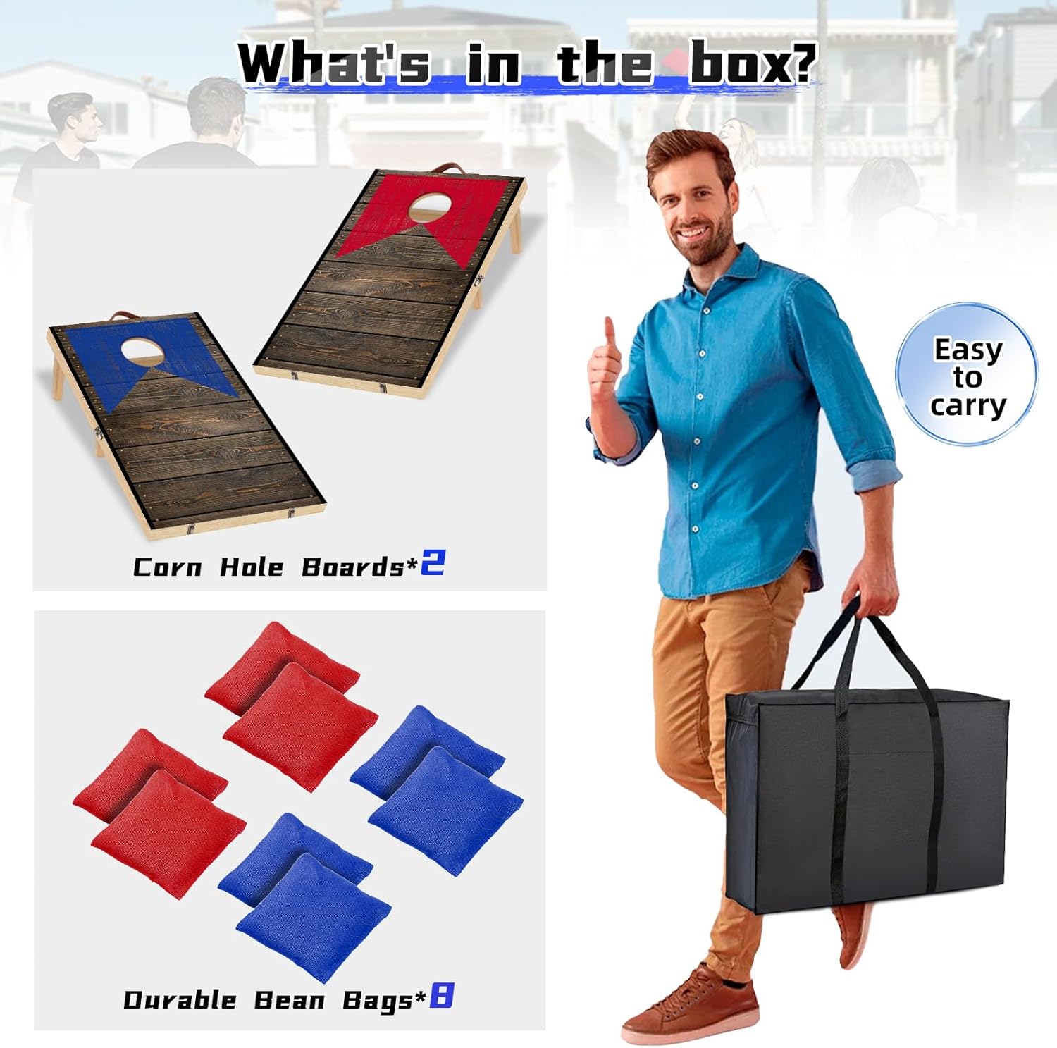 This solid wood cornhole set is sturdy, portable, and ready to play out of the box. With multiple size optionsâincluding a tabletop mini versionâit suits any space or occasion. The double-stand legs provide extra stability, and the canvas bean bags are durable and well-made. Folding boards and a carry bag make transport easy. Perfect for all ages and events, from backyard BBQs to beach days. A great all-in-one set for fun anywhere.