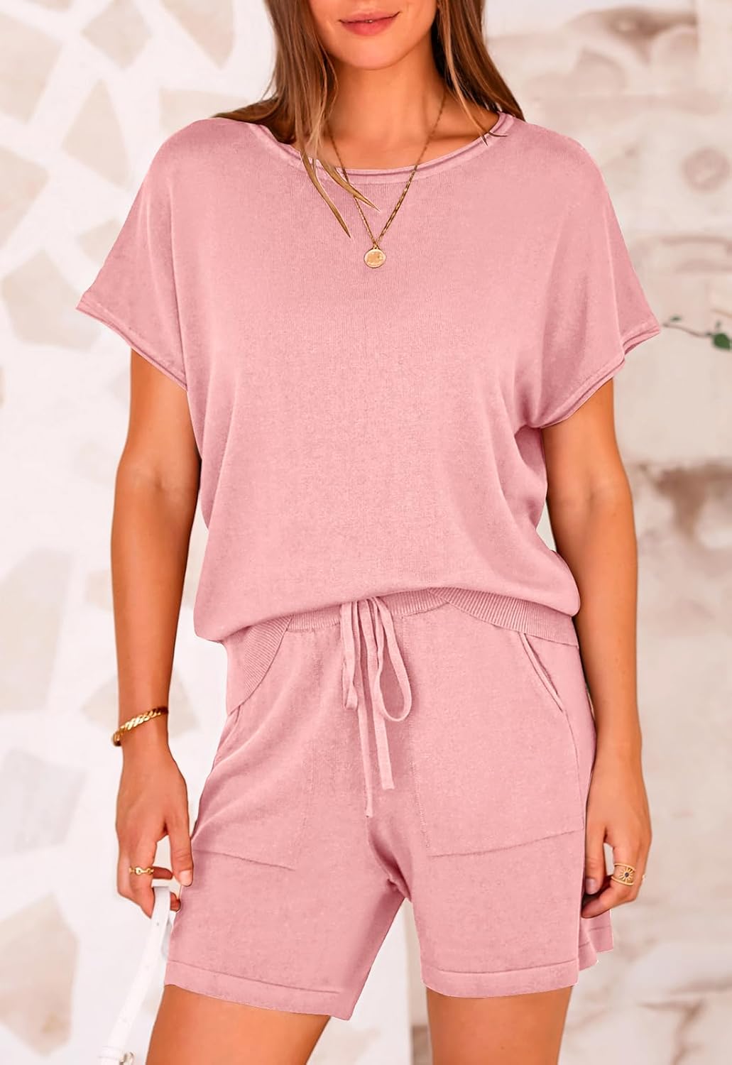 8 reviews for PRETTYGARDEN Two Piece Set For Women Summer Lounge Sets Shorts And Short Sleeve Tops Knitted Matching Travel Spring Outfits