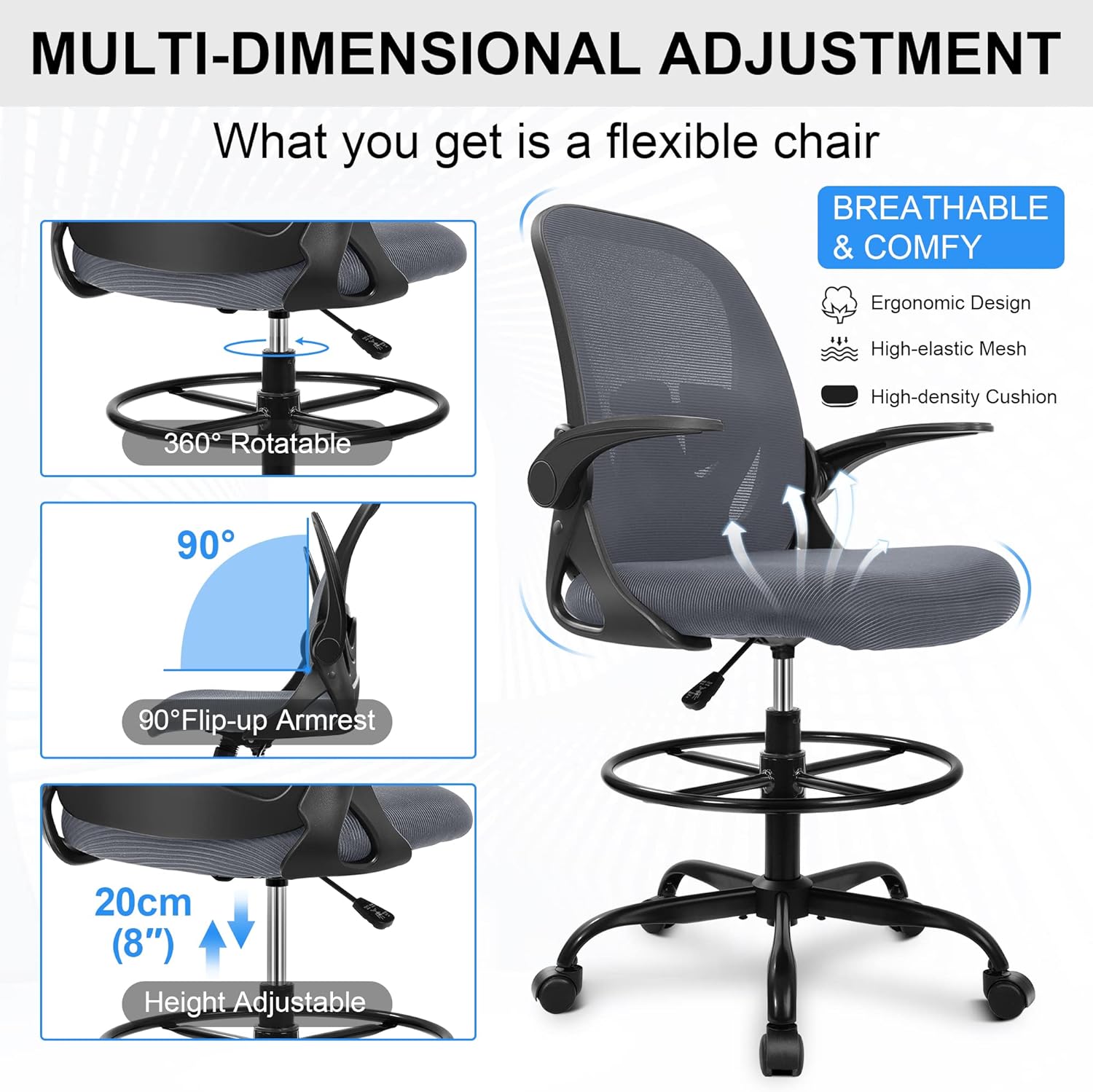 10 reviews for Primy Drafting Chair Tall Office Chair with Flip-up Armrests Executive Ergonomic Computer Standing Desk Chair with Lumbar Support and Adjustable Footrest Ring(Dark Gray)