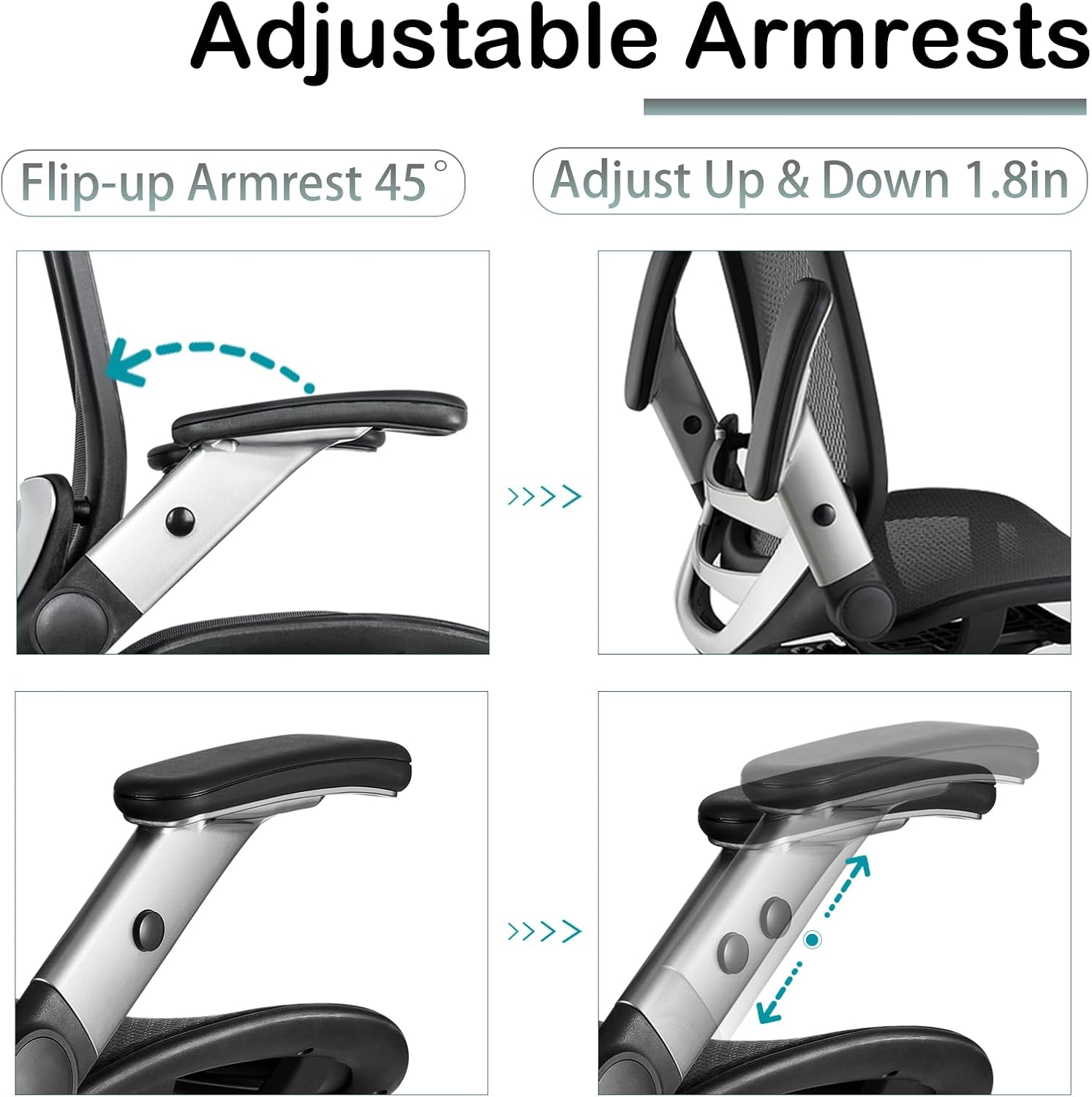 Space-saving Flip-up Armrest – By flipping the arms of the desk chair up 45°, you can push the executive office chair right under your desk, saving valuable space. You can easily raise or lower the arms by simply pressing the black buttons of your office chair to give the hands a proper support.