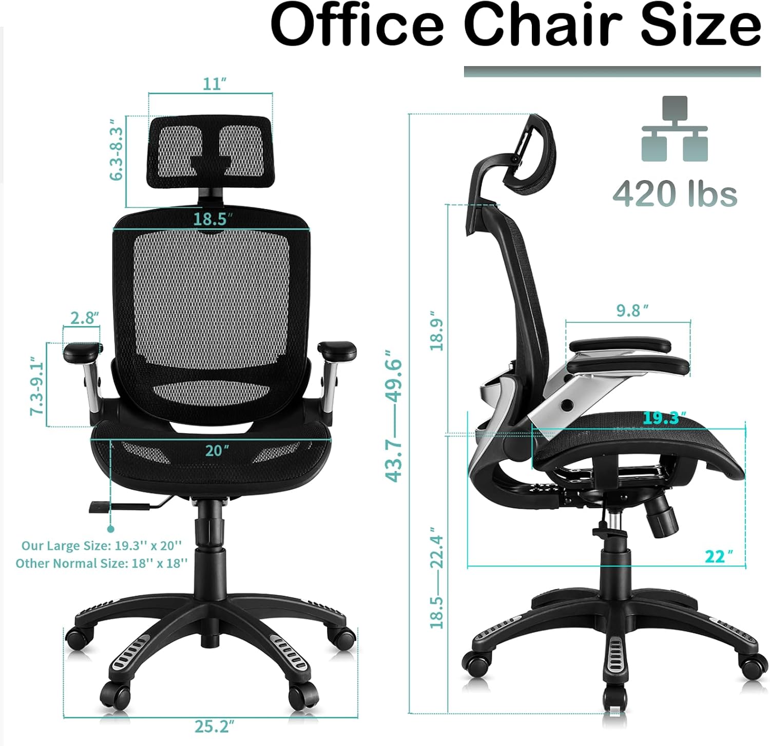 Comfortable Wide Seat – The big and tall office chair is larger than other chairs, suitable for different people. Chair size: 25.6″Wx22″Dx45.3″-54.9″H. Seat size: 20″Wx19.3″Dx18.5″-22.05″H. Weight capacity: 420 lbs. The reclining function of office chair allows you to tilt the backrest back 90°~120°.