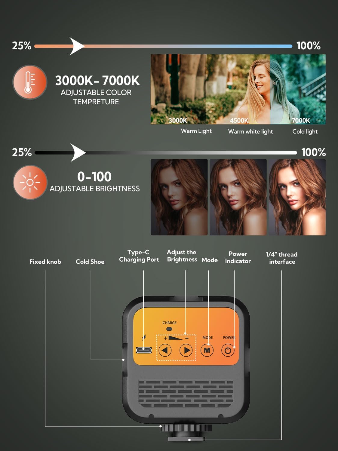 TRICOLOR FILL LIGHT-Adjustable brightness LED light with Built-in Rechargeable Battery. The color temperature can be adjusted from 3000k to 7000k for various shooting scenarios and several photography needs. To get a suitable brightness for your video,light your beauty anytime anywhere.
