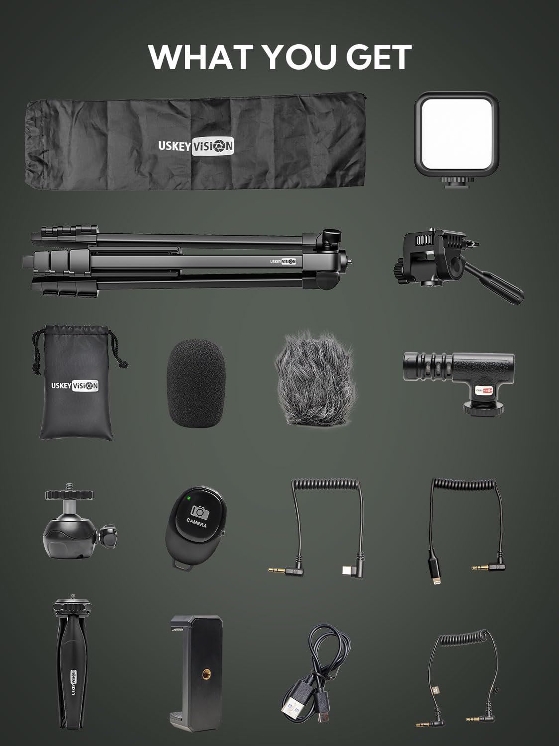 SMARTPHONE VIDEO RECORDING KIT- A complete premium vlogging kit, content creator kit for iPhone and other smartphones, including a 59”extendable phone tripod, adjustable tabletop,3000k-7000k tricolor LED light, shotgun microphone, phone clip, ball head mount, remote control, microphone cables, and two pouches.