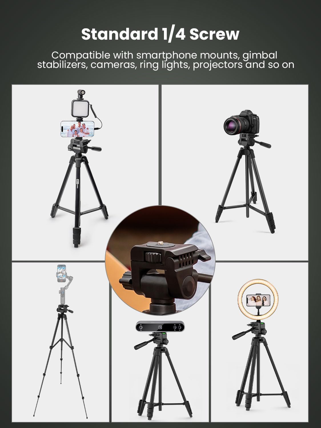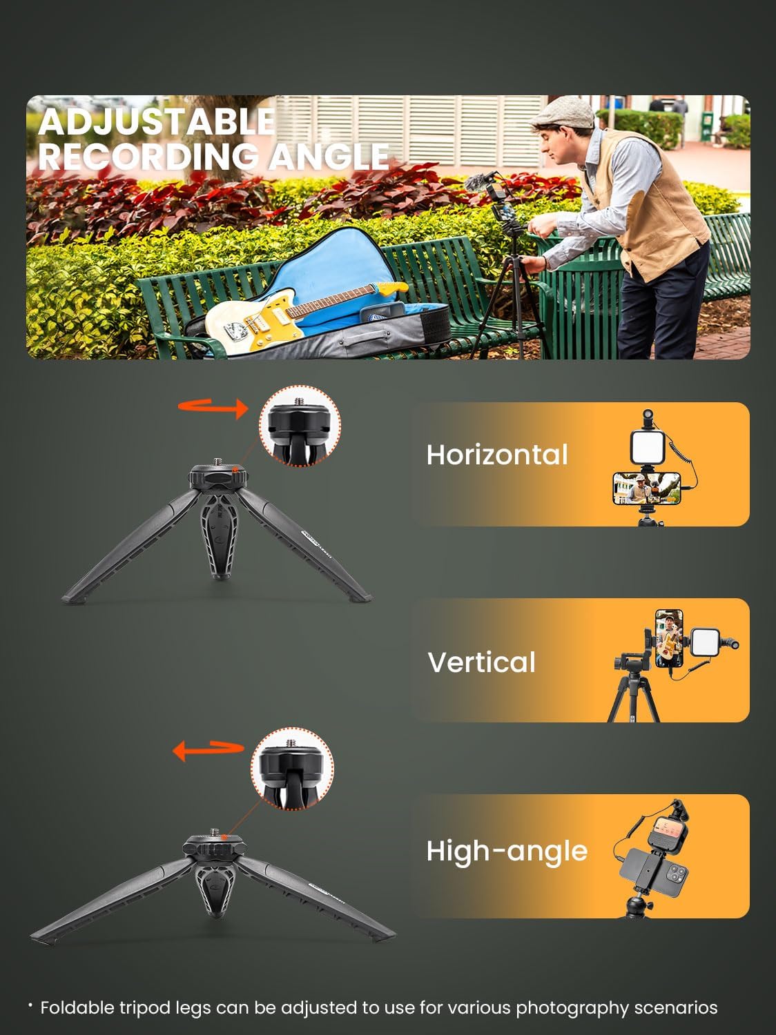 MULTI-APPLICATION TRIPODS-Except the adjustable tabletop, the full-size tripod can be adjusted from 17.2”to 59”with 3 adjustable quick-turn leg locks, which will be conveniently set up/removed for various shooting environments and photography needs including professional filming and social media video recording like YouTube, TikTok, Live Steam, Vlogging and more.