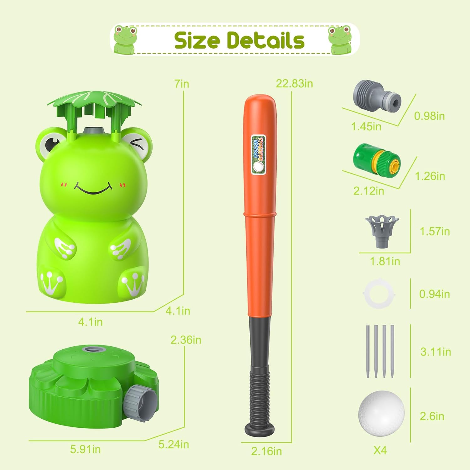 2 IN 1 WATER SPRINKLER BASEBALL TOY: Our spray sprinkler has a cute design as a frog and can rotate 360°. This water sprinkler is a yard water toy but also a baseball toy for 3-8 years old boys and girls. Kids sprinklers provide children with 2 ways of water play experiences and keep children cool this hot summer
