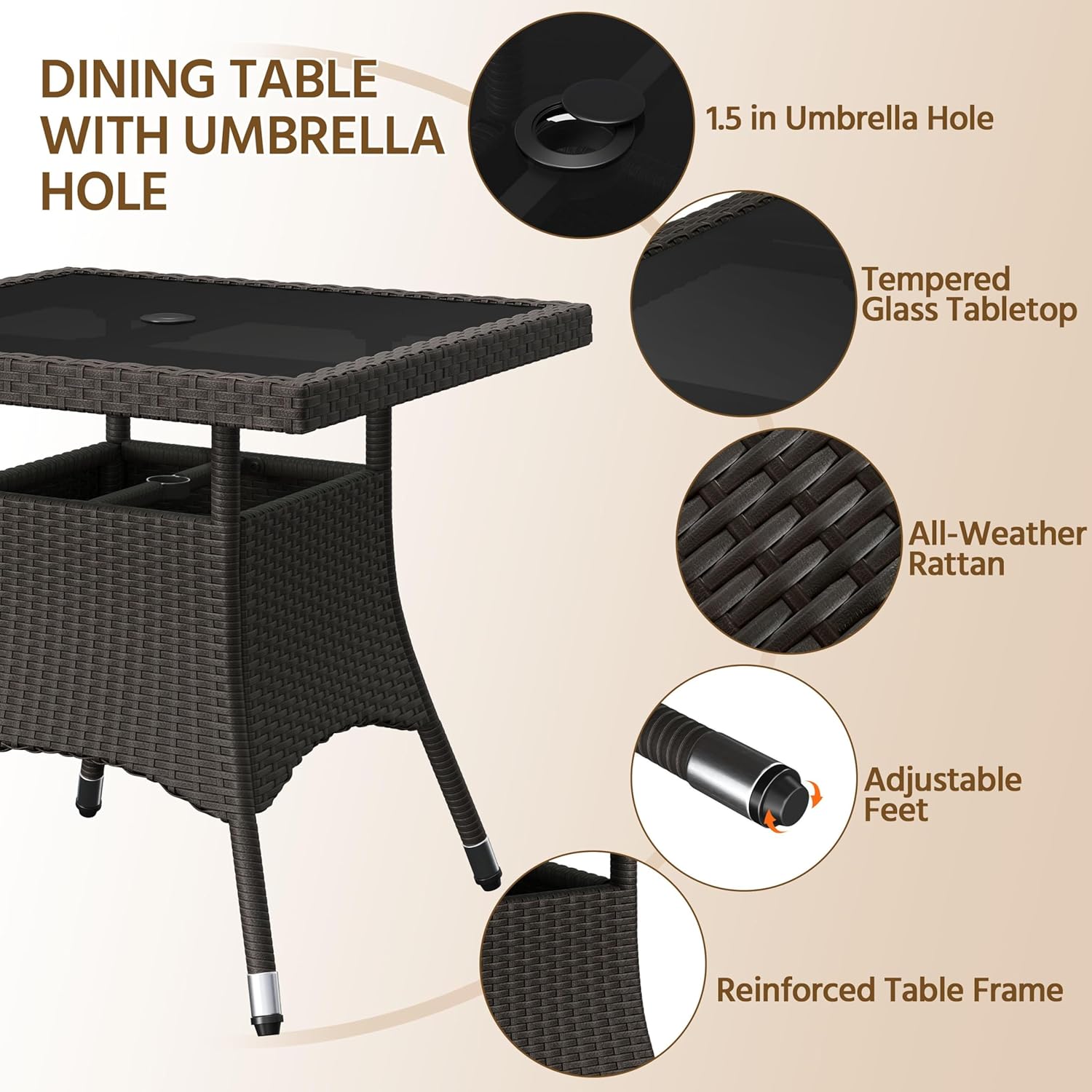 Secure Construction: Both the dining chairs and table are constructed into a solid and firm structure. Frame by water-resistant powder-coated iron, each piece are reinforced by a circle of PE rattan panels under the tabletop or seat to connect the legs into a stable single integration
